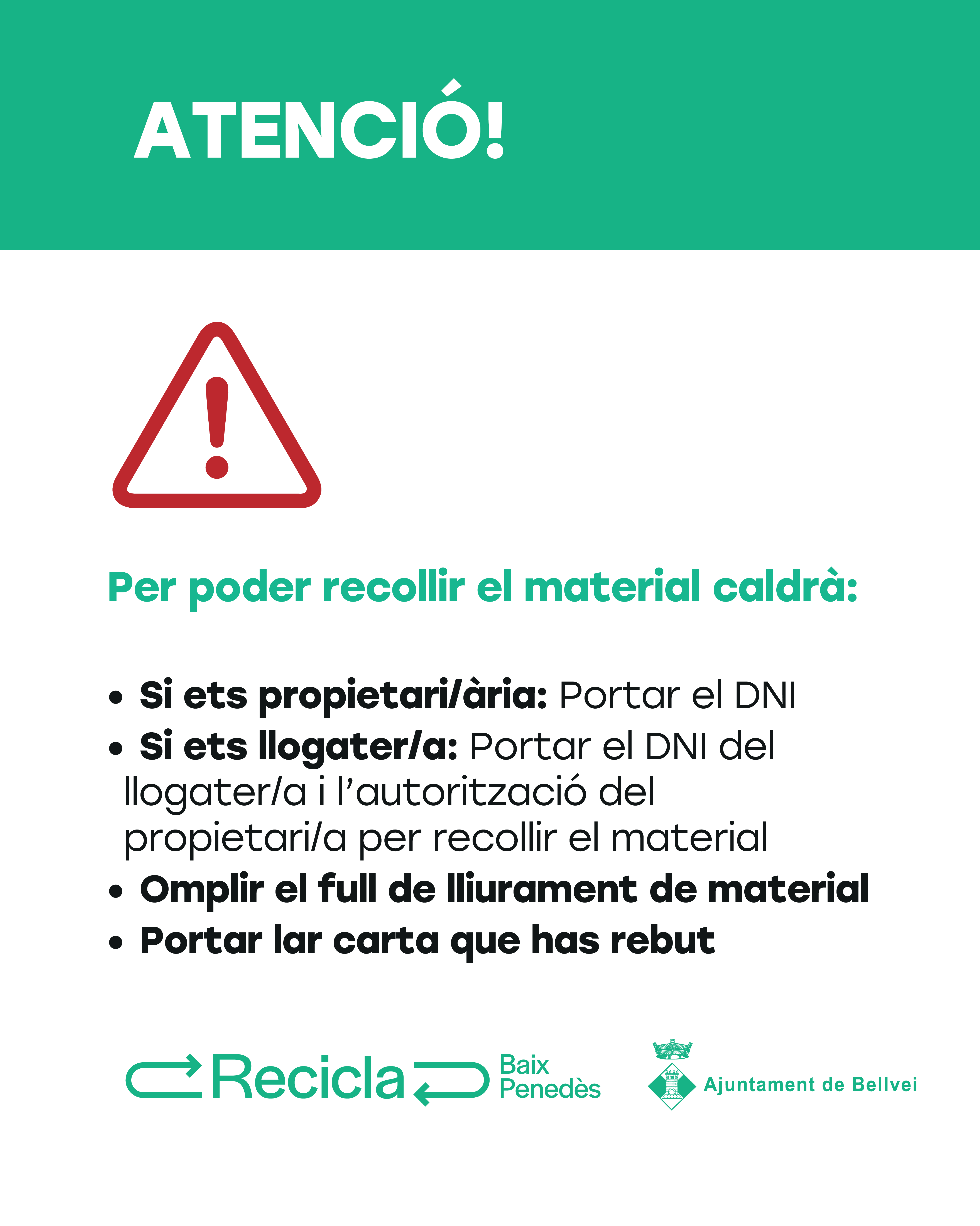 ⚠️ Què has de portar per recollir el material: ✅ Si ets propietari/ària: DNI ✅ Si ets llogater/a: El teu DNI i l'autorització del propietari/ària ✅ Full de lliurament de material ✅ La carta que has rebut a casa (molt important!)